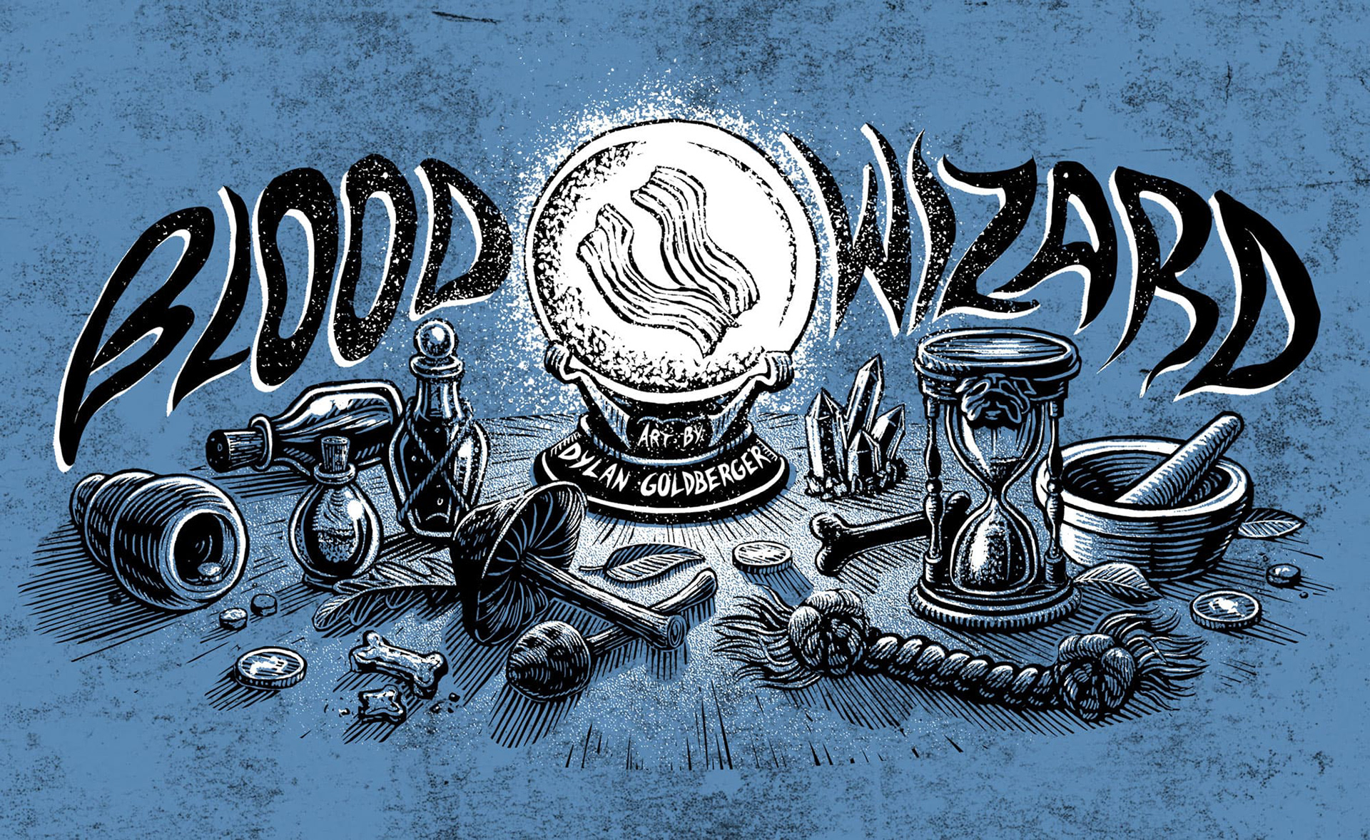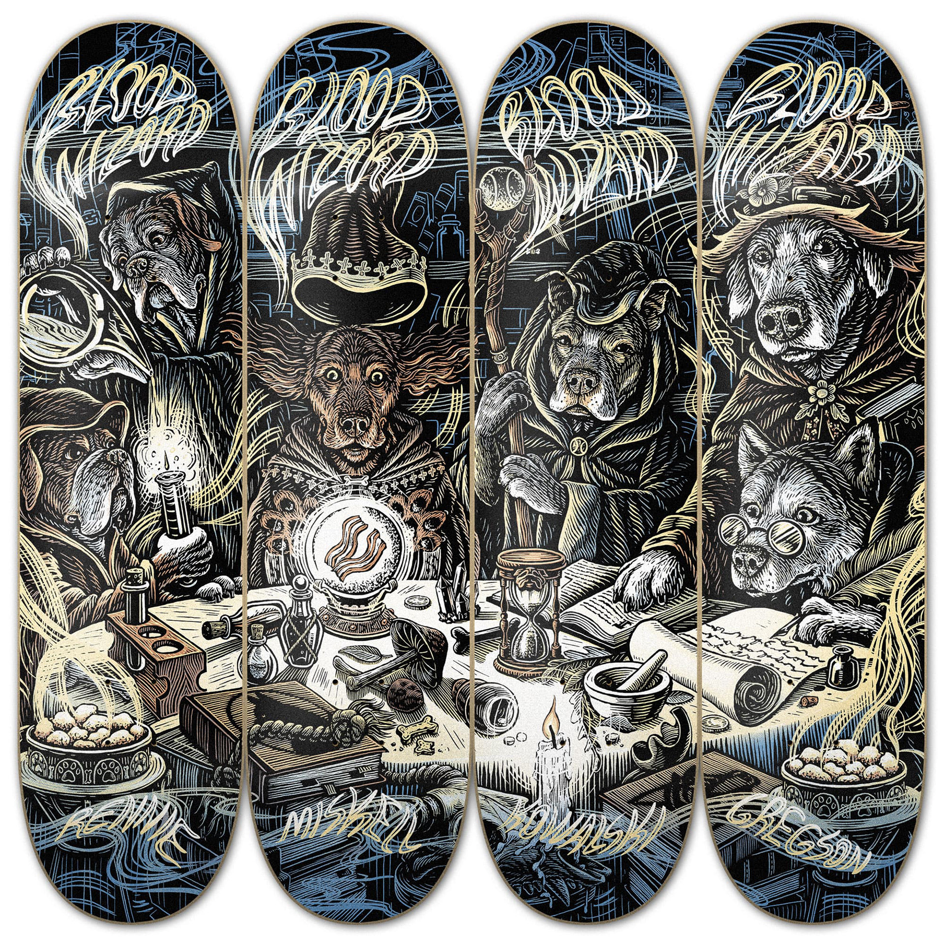 Board Series and limited edition screen print for Blood Wizard Skateboards. Each board features the pro team rider's dog reimagined as a wizard.